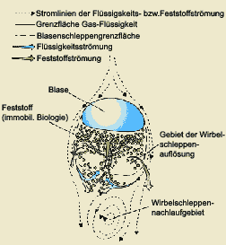 aktive (immobilisierte) Biomasse (braun) und Luftsauerstoff (dunkelblau), die maßgeblich zur